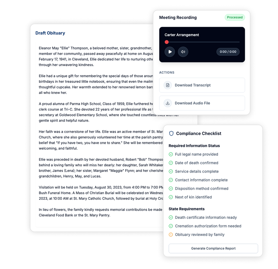 Record or upload your arrangement conversation and watch it transform into structured data. Names, dates, service details, and family contacts are extracted automatically—ready to review, edit, and share.